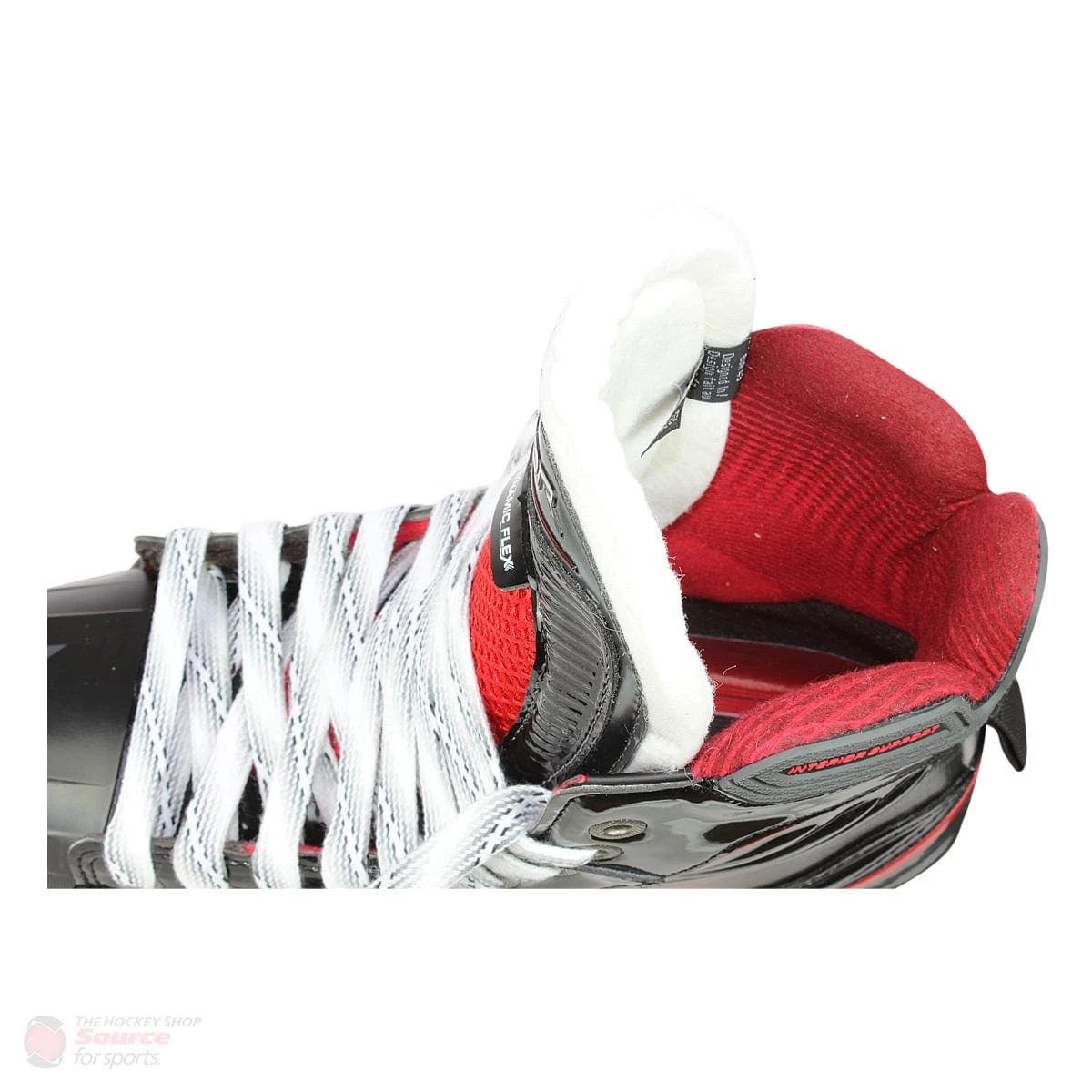 Bauer has completed the transition away from goalie cowlings to goalie holders. In 2011, they re-designed and changed the industry standard for a goalie cowling, and in 2016 they have gotten rid of the cowling all together. Bauer is the first company to rid of the protective, conventional cowling and replace it with a goalie-standard, yet player-like holder. The new VERTEXX EDGE holder looks like that of a player holder, but, of course, it has a flat design to cater to the flat steel that goalies use. This new holder increases the overall skate height by 5mm, which then increases the goalie’s attack angle by 10% from the original VERTEXX cowling and 38% from any traditional cowling. The new holder also features Bauer’s new 3mm LS3G stainless steel removable runner that has a better surface finish for a longer lasting sharpening. ERGOTOE is a reinforced toe cap that protects the foot from any pucks that hit the toe box. The Vapor 1X goal skates are constructed with a 3D anaformable Curv Composite boot. Bauer’s Curv composite is a strong material that will hold the foot in a locked-in position, for more consistent strides on the ice, and also protects the foot from any contact. The 1X boot is designed with X-Wrap extended facing, to allow for more boot depth; the deeper boot design allows for the goalie to sit in their stance with less lace-tension and lace-bite. Dynamic Flex boot collar and tongue allow for more forward flexion, and the tongue has an asymmetrical profile that follows the shape of the top of the foot. LOCK-FIT PRO liner features grip in key zones to keep the foot locked into place, ensuring optimal fit and performance.