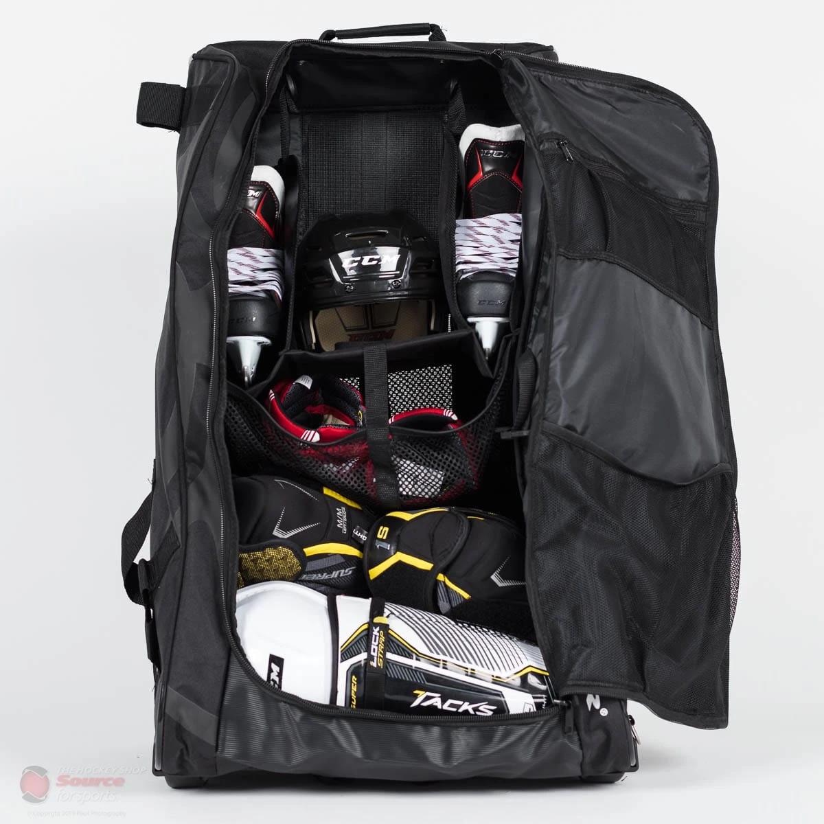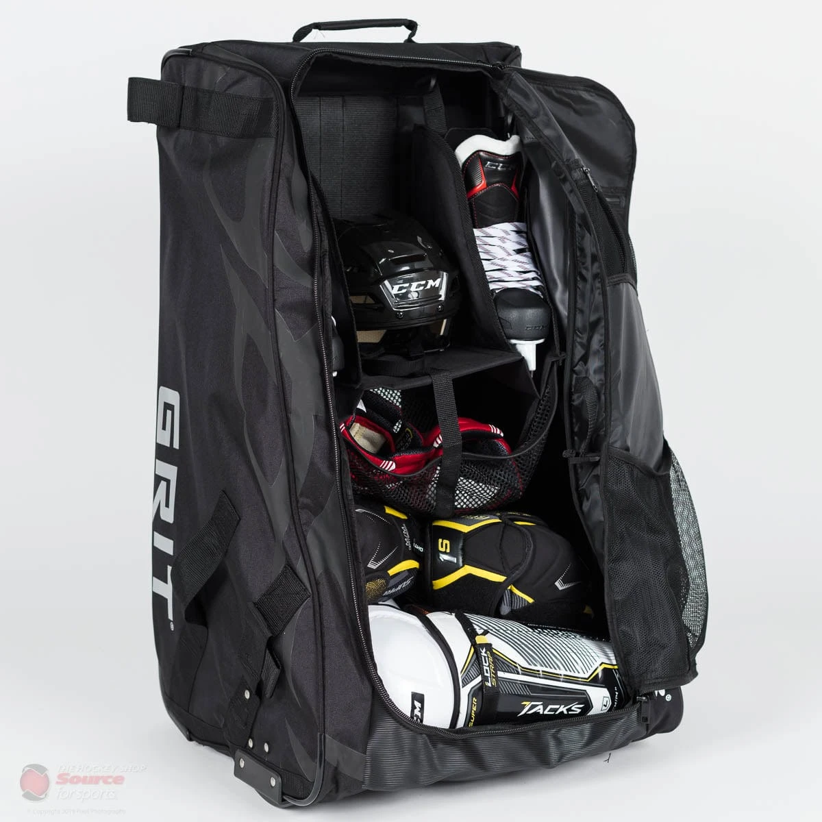 The Grit HTFX Hockey Tower Bag is perfect for all ages. The Newly lightweight and flexible bag comes in 2 sizes, Junior (33 inches) and Senior (36 inches). An upgrade to the previous hockey tower models, this bag?s torsion technology folding frame system allows the players to use it more efficiently. With three new major upgrades, along with other upgrades to the overall bag, the new 33% reduction in its overall weight makes it easier to carry. Another new feature added to the Grit HTFX Hockey Tower Bag is the side panel shoulder strap to help make the bag easier to move around. The Torsion Technology folding system allows for a more flexible bag in terms of product efficiency and getting the bag to fit into a more compact space. The newly introduced shelf system incorporated on the inside of the bag is the perfect organizing tool. Additionally, the large flow-through ventilation system in the back of the bag is the ideal way to release odour. To top it all off, the blade port and stick strap are the perfect features to minimize the extra carrying load.