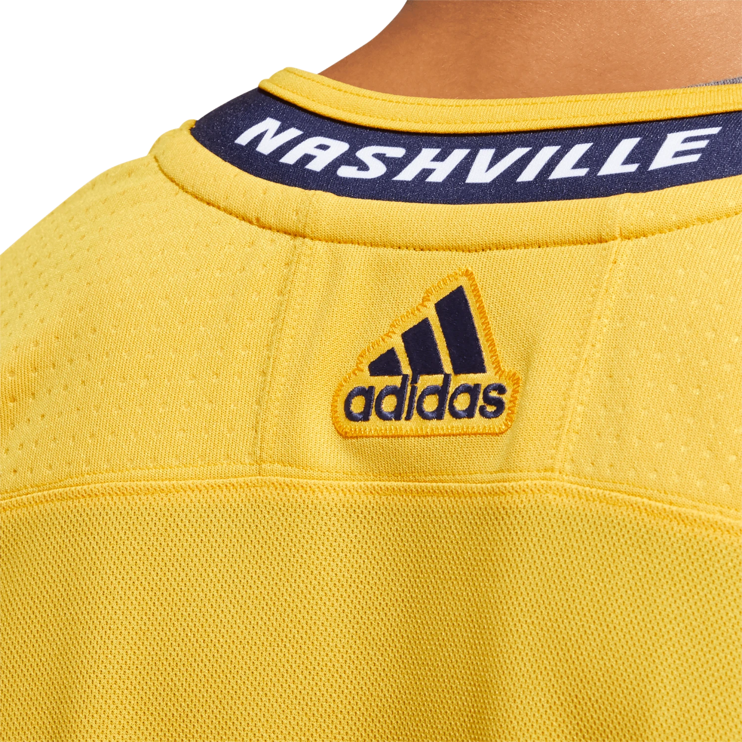 Pull on this adidas Nashville Predators authentic home jersey, and get the gang together for game night in your fan cave. AEROREADY keeps you cool and dry as you wait for the puck to drop at center ice. The big crest out front, shoulder patches and a fight strap with a snap closure keep the look legit. This product is made with Primegreen, a series of high-performance recycled materials.