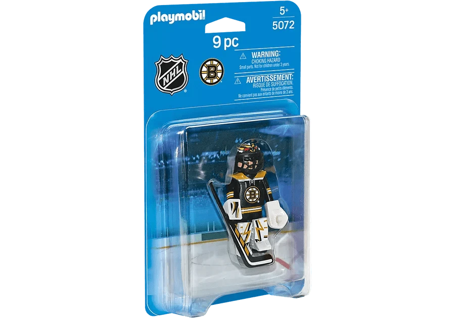Back the net with the NHL™ Boston Bruins™ Goalie. Set includes 1 Boston goalie, 1 stick, 1 puck, helmet with visor, goalkeeper glove, and 1 arm cuff.