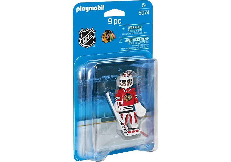 Back the net with the NHL™ Chicago Blackhawks™ Goalie. Set includes 1 Chicago goalie, 1 stick, 1 puck, helmet with visor, goalkeeper glove, and 1 arm cuff.