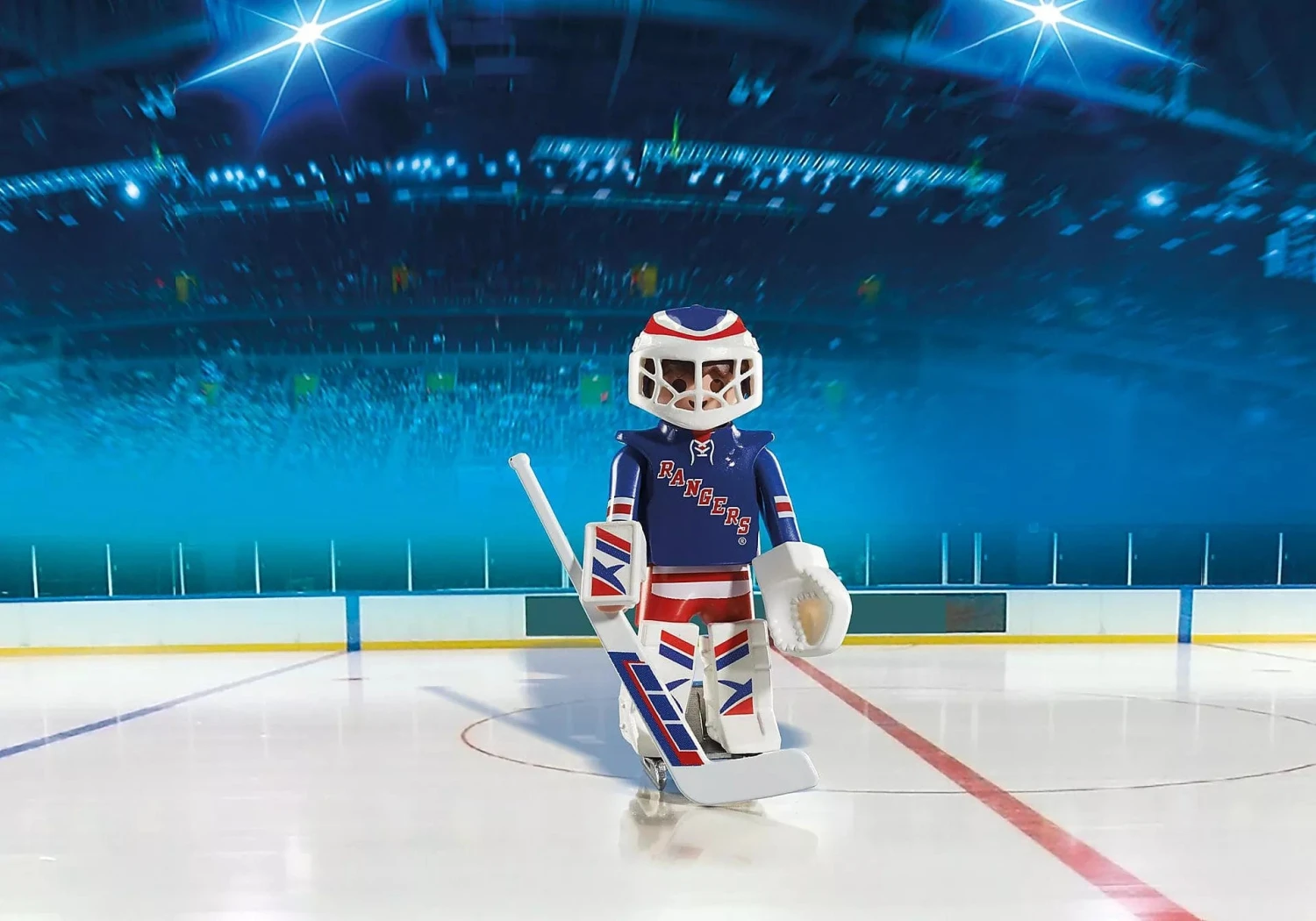 Back the net with the NHL™ New York Rangers™ Goalie. Set includes 1 Rangers goalie, 1 stick, 1 puck, helmet with visor, goalkeeper glove, and 1 arm cuff.