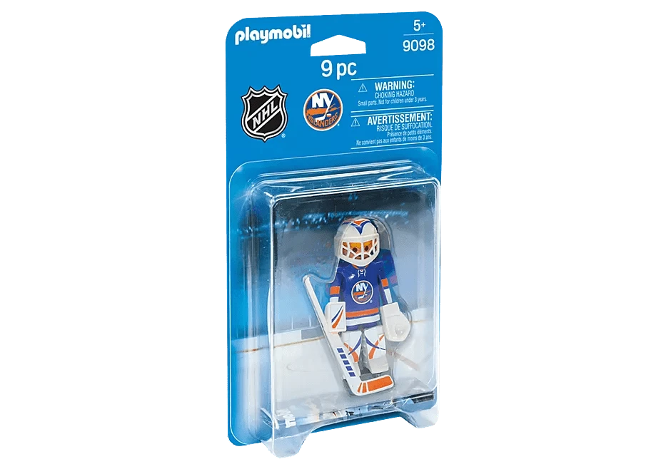 Back the net with the NHL™ New York Islanders™ Goalie. Set includes 1 New York Islanders goalie, 1 stick, 1 puck, helmet with visor, goalkeeper glove, and 1 arm cuff.