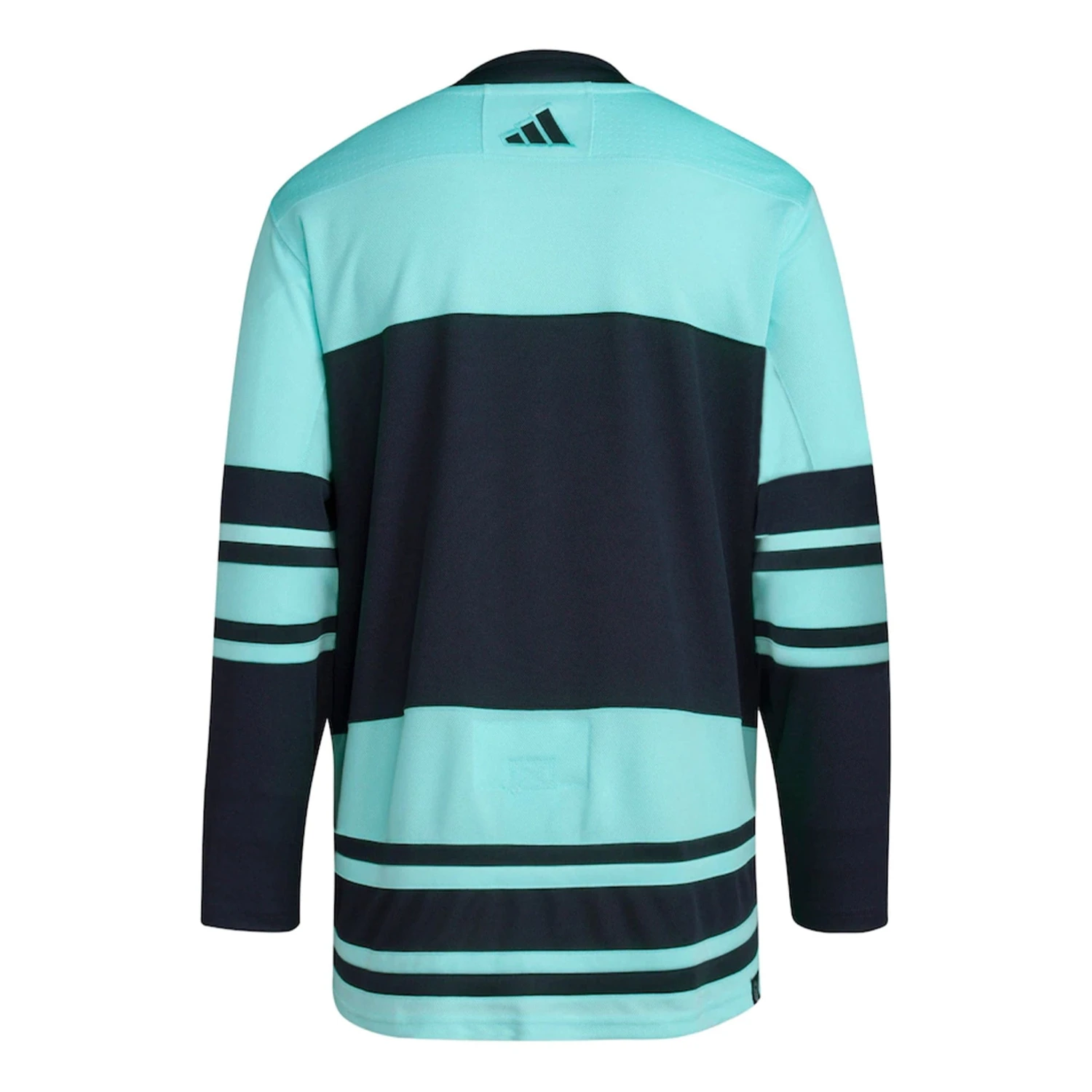 Pull on this Seattle Kraken Adidas PrimeGreen Reverse Retro Senior Jersey, and get the gang together for game night in your fan cave. AEROREADY keeps you cool and dry as you wait for the puck to drop at center ice. The big crest out front, shoulder patches and a fight strap with a snap closure keep the look legit. This product is made with Primegreen, a series of high-performance recycled materials.
